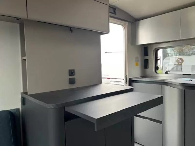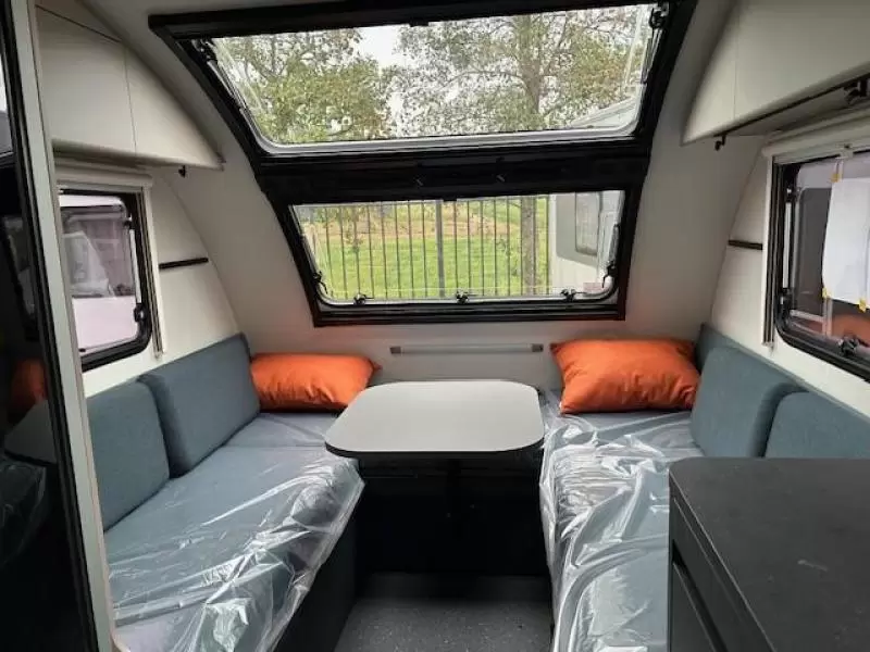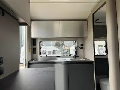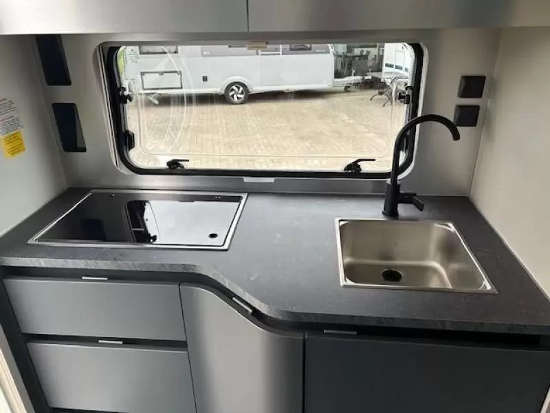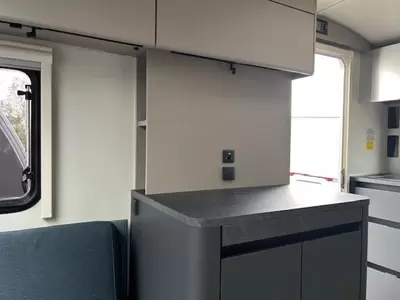 De handige standaardzit biedt niet alleen de nodige ruimte om te zitten, maar kan ook als slaapgelegenheid worden gebruikt. De keuken bevindt zich vlak bij de entree aan de achterzijde van de caravan. Er is een boiler aanwezig, die u van warm water voorziet. De ingebouwde koelkast met vriesvak is uitgevoerd in een ruime uitvoering.