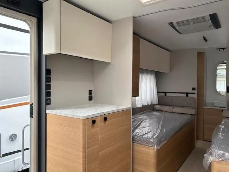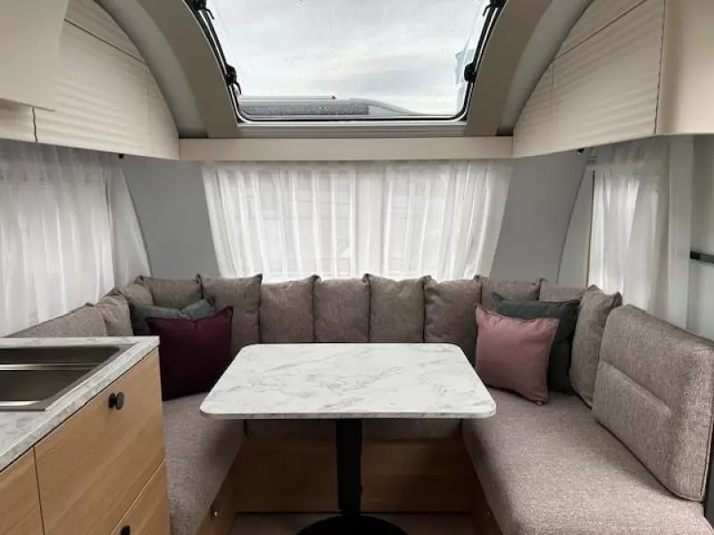 Tijdens de warmste dagen blijft het binnen aangenaam koel door de airco en het grote dakluik. Een opvallende optie is de vloerverwarming, die ook op koudere dagen voor een comfortabel gevoel in de caravan zorgt.