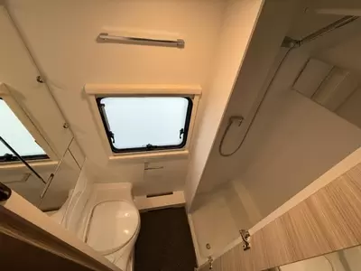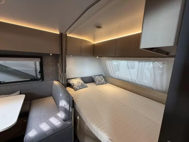 Kinderen zullen zich direct op hun gemak voelen in het goed bereikbare, langs geplaatste stapelbed. Twee personen vinden voldoende plaats in het ruime dwars geplaatste bed. Aan slaapcomfort zal het u in deze caravan, die is voorzien van lattenbodems en traagschuimmatrassen, niet ontbreken. Deze caravan beschikt over een badkamer. Hierin bevindt zich een wastafel en ingebouwd cassettetoilet.
