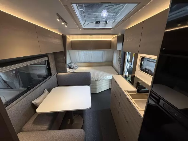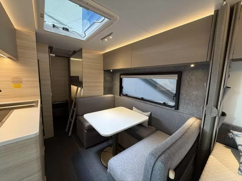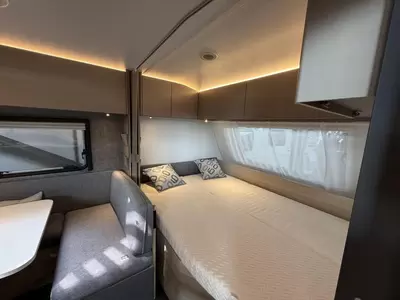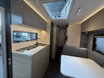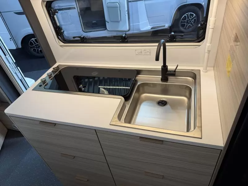 De centraal geplaatste middendinette biedt volop gelegenheid voor heerlijke maaltijden en gezellige avonden. De middenkeuken, waar de caravan over beschikt, is onder meer voorzien van een 3-pits kooktoestel, spoelbak en kraan. Er is een boiler aanwezig, die u van warm water voorziet. De praktische ladekast is een handige plek voor de keukenbenodigdheden.