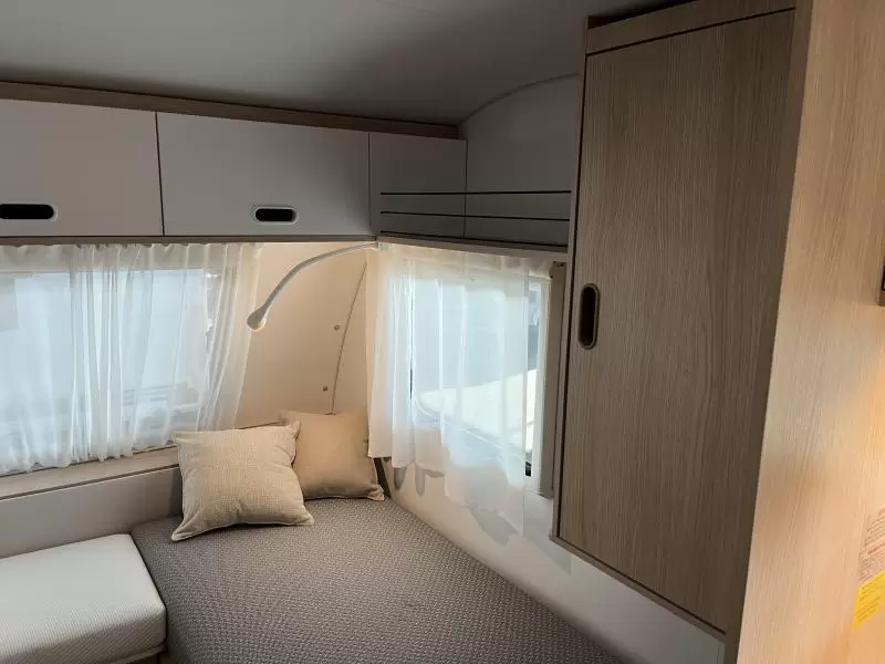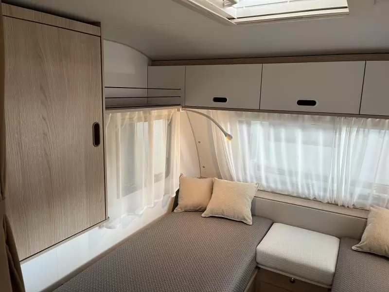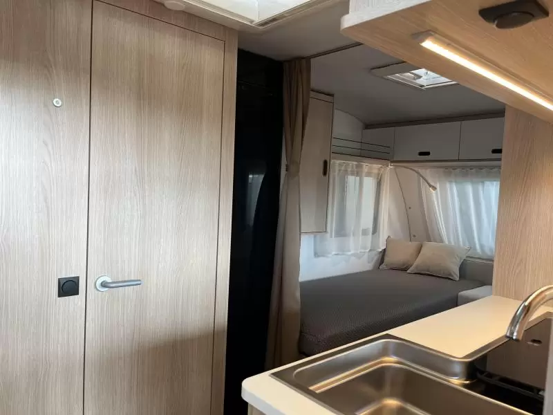 De standaardzit biedt niet alleen de nodige zitgelegenheid, maar kan ook worden omgebouwd tot slaapplaats. De caravan beschikt over een middenkeuken met voldoende bergruimte, die praktisch is ingericht en met een 3-pits kooktoestel, spoelbak en kraan is uitgevoerd. Voor een snelle toevoer van warm water is er een 5 liter boiler aanwezig. De koelkast (142 liter) met vriesvak biedt voldoende ruimte voor heel uw voorraad.
