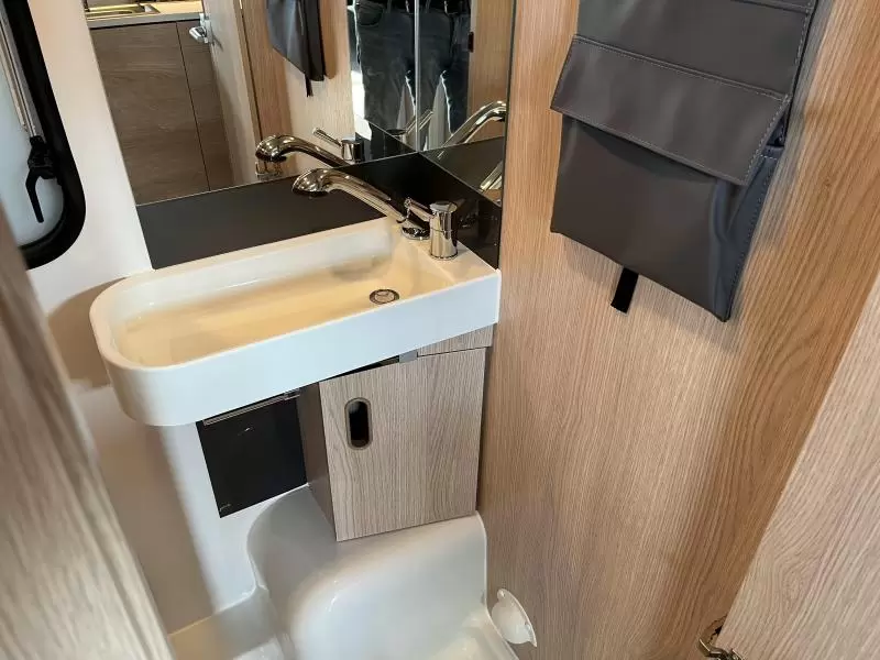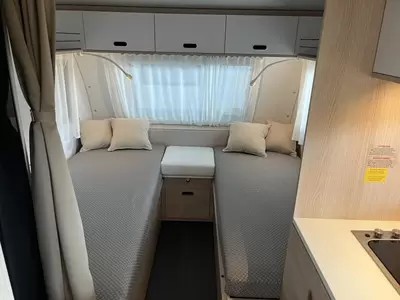 Slapen doet u op de 2 aparte bedden, die borg staan voor extra ruimte en een makkelijke instap. In de badkamer vindt u een wastafel om u op te frissen, alsmede een ingebouwd cassettetoilet. In de caravan kunt u ook douchen. Er bevindt zich een doucheruimte naast het slaapgedeelte.
