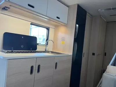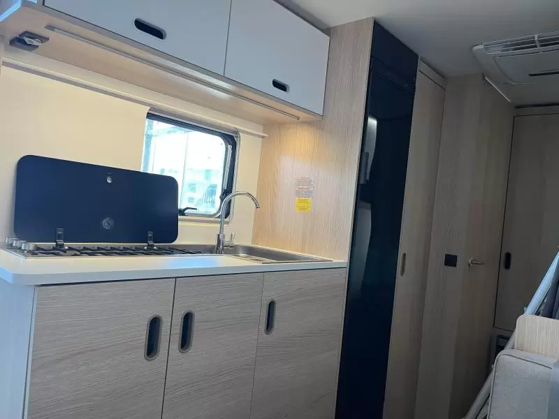 De uitnodigende middendinette is de ideale plek om samen te eten en te drinken. Het keukenblok is centraal in de caravan gemonteerd en is onder anderen uitgerust met een 3-pits gascomfoor, spoelbak en kraan. De boiler, die in de caravan is ingebouwd, voorziet u snel van warm water. Om uw etenswaren op te bergen is er een koelkast (142 liter) met vriescompartiment ingebouwd.