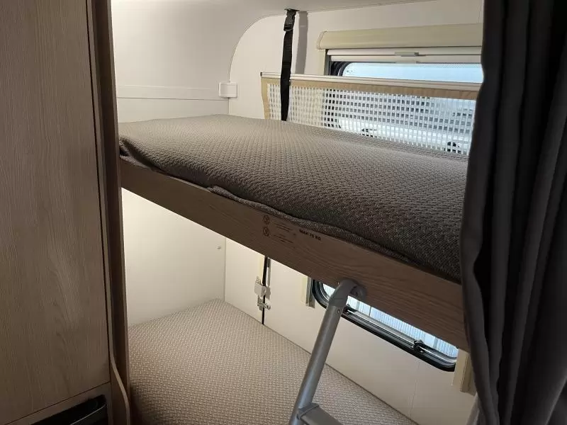 Uw kinderen zullen hun eigen plekje in het langs geplaatste, goed toegankelijke stapelbed absoluut waarderen. In het ruime, dwars geplaatste bed kunnen 2 personen slapen. Behalve een cassettetoilet heeft de badkamer ook een wastafel, waar u zich lekker op kunt frissen. In de caravan kunt u ook douchen. Er bevindt zich een doucheruimte naast het slaapgedeelte.