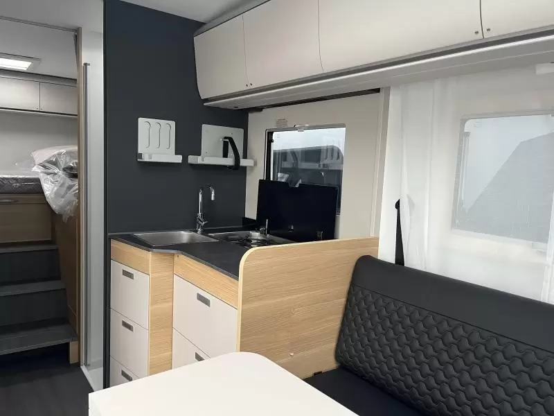 Het keukenblok is centraal in de camper gemonteerd en is onder anderen uitgerust met 3-pits gascomfoor, spoelbak en kraan. Een ingebouwde boiler voorziet u van warm water. De ingebouwde koelkast met vriesvak is uitgevoerd in een ruime uitvoering.