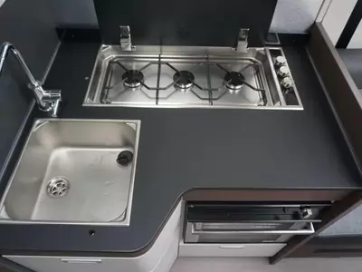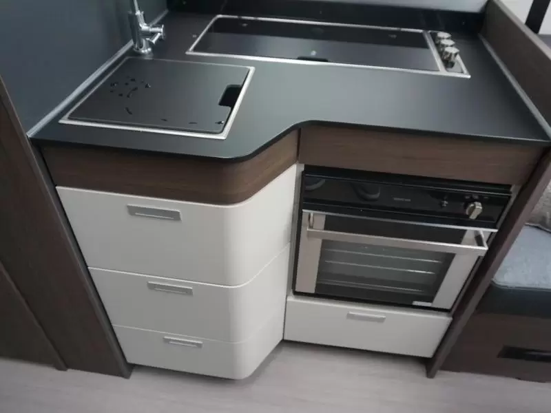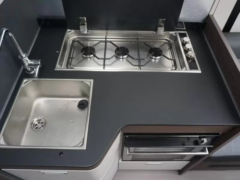 De luxueuze keuken van deze Adria is geheel compleet uitgevoerd, met ondermeer een afzuigkap voor het afvoeren van de kook- en bakluchtjes en met een oven om verse broodjes te bakken en ovenschotels te bereiden. Een ingebouwde boiler voorziet u van warm water. De koelkast met vriescompartiment is ruim genoeg voor al uw etenswaren.