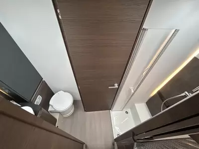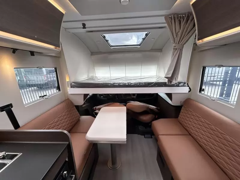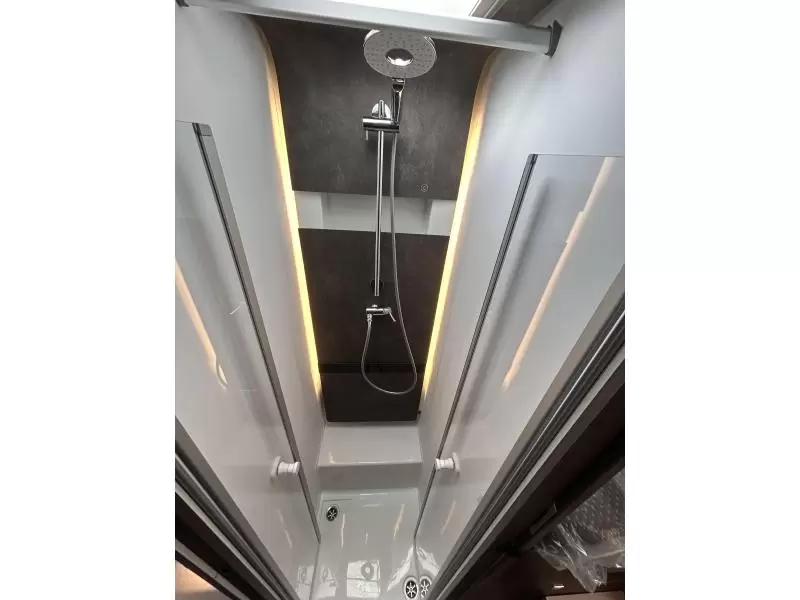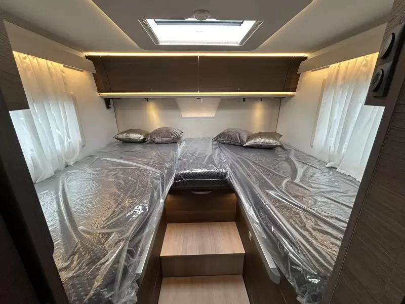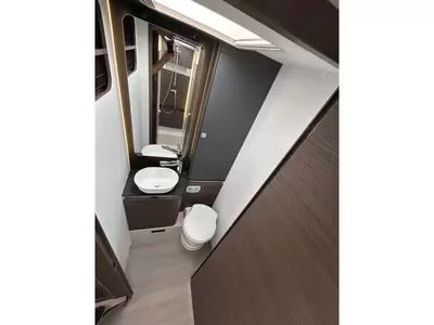 Er wordt veel ruimte bespaard door het gebruik van het tweepersoons hefbed boven de zitgroep. De aparte bedden bieden een makkelijke instap en een slaapgelegenheid voor 2 personen. In de badkamer, waar deze camper over beschikt, vindt u een ingebouwd cassettetoilet en een wastafel. In de camper kunt u ook douchen. Er bevindt zich een doucheruimte naast het slaapgedeelte.