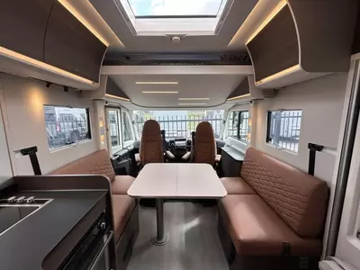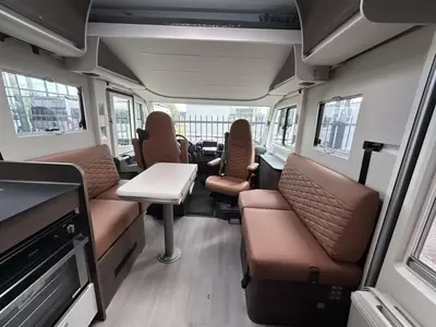 Heerlijke ruime living met luxe cognac kleurige lederen bekleding, dmv. de klaptafel creeert u een ruime doorgang van cabine naar living.