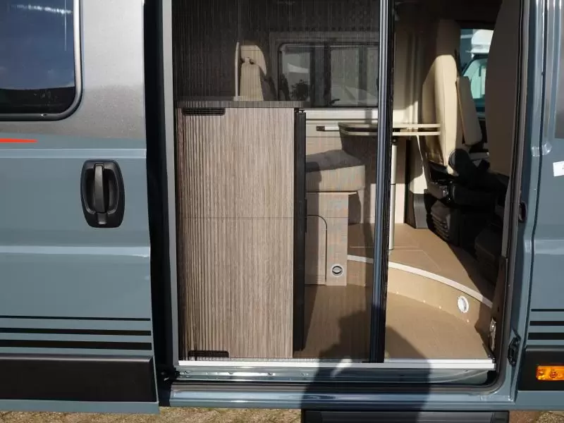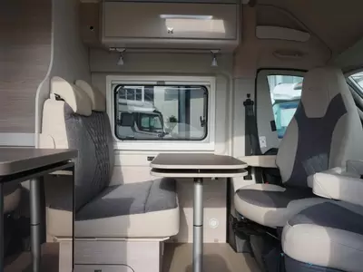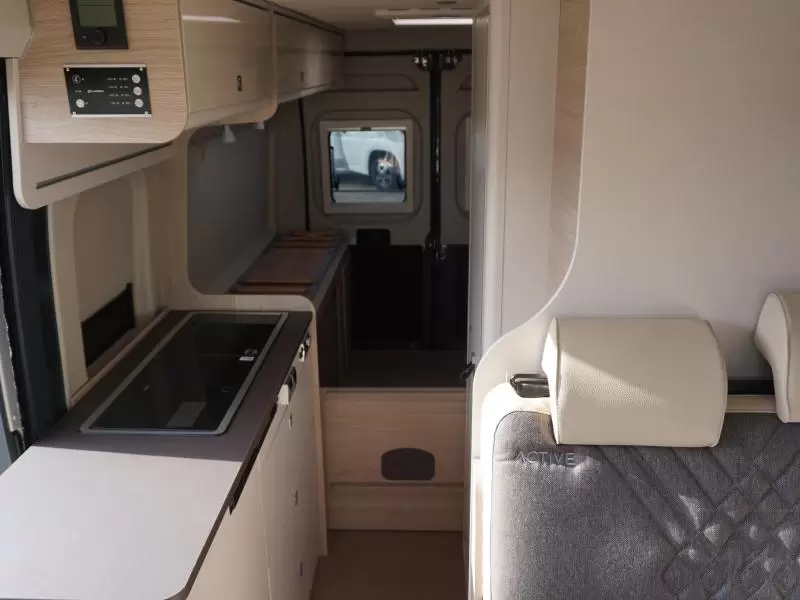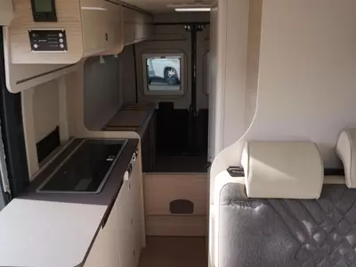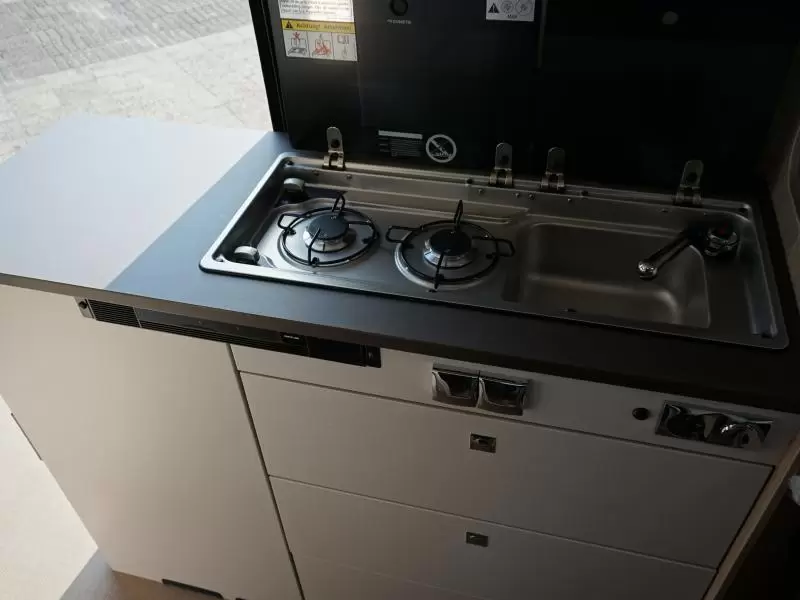De handige standaardzit biedt niet alleen de nodige ruimte om te zitten, maar kan ook als slaapgelegenheid worden gebruikt. De keuken is in het midden van de camper gemonteerd. Voor een snelle toevoer van warm water is er een boiler aanwezig.