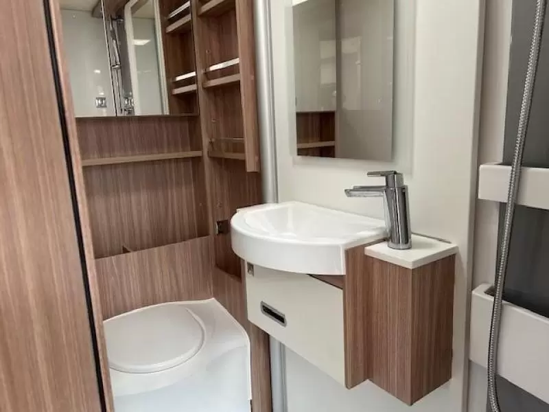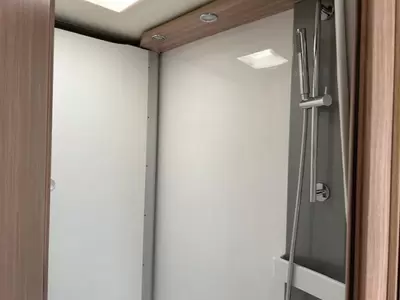 Het in de lengte van de camper geplaatste bed biedt voldoende ruimte voor 2 personen. De badkamer biedt wasgelegenheid in de vorm van een wastafel. Tevens is er een ingebouwde cassettetoilet aanwezig. In de camper kunt u ook douchen. Er bevindt zich een doucheruimte naast het slaapgedeelte.