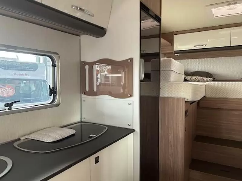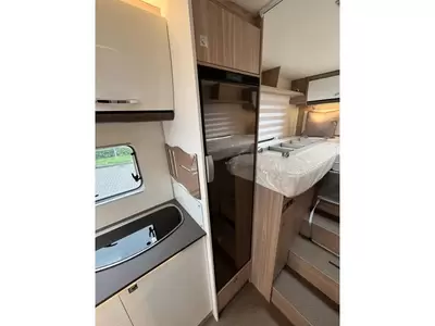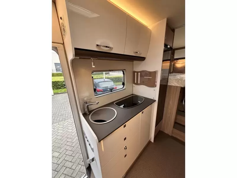 De centraal geplaatste middendinette biedt volop gelegenheid om gezellig samen te zitten. Het keukenblok is centraal in de camper gemonteerd en is onder anderen uitgerust met 3-pits gascomfoor, spoelbak en kraan. Voor het opbergen van uw voorraad is er een apothekerskast aanwezig. De boiler, die in de camper is ingebouwd, voorziet u snel van warm water. De inbouwkoelkast met vriescompartiment heeft een grote inhoud.