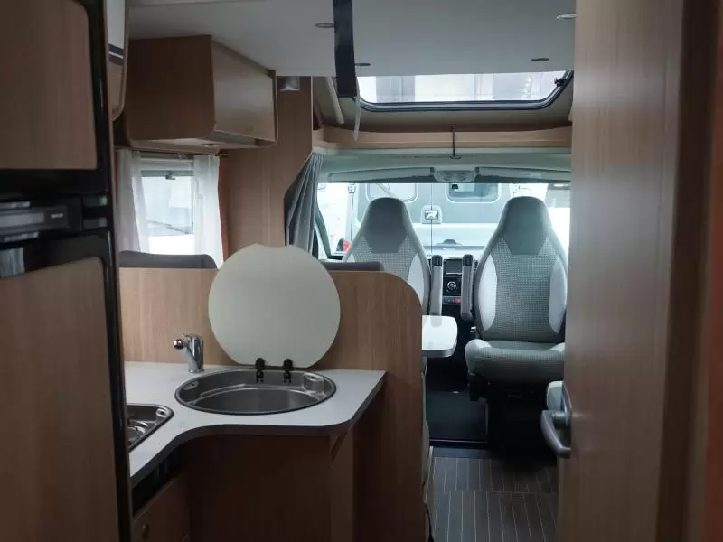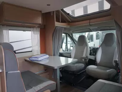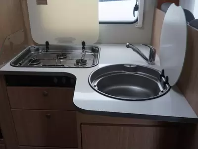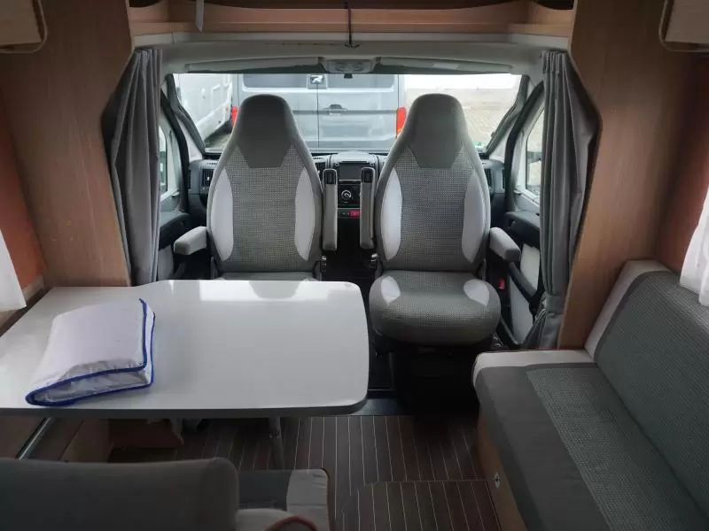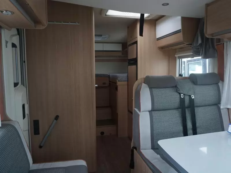 De camper is voorzien van een handige L-zit voor een sfeervol samenzijn. De koelkast met vriescompartiment is ruim genoeg voor al uw etenswaren.