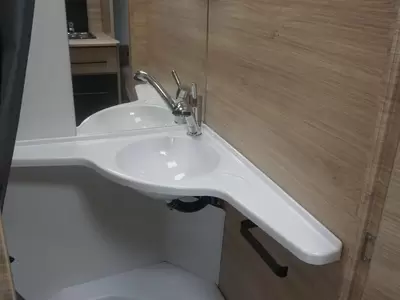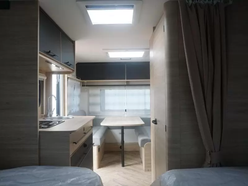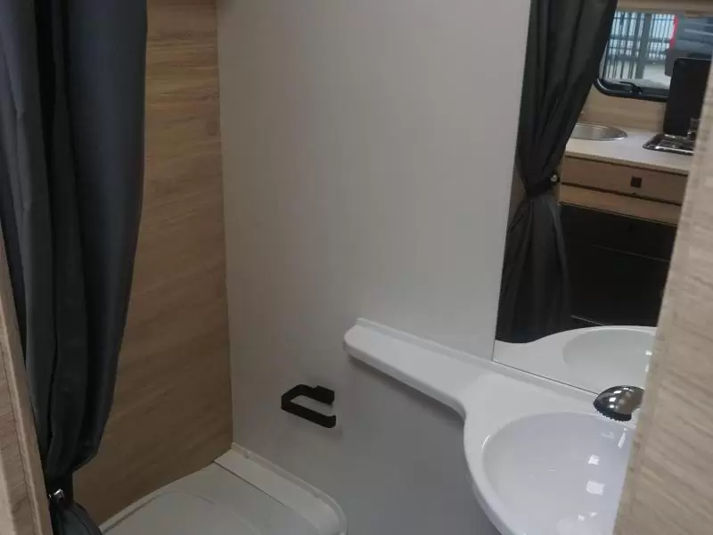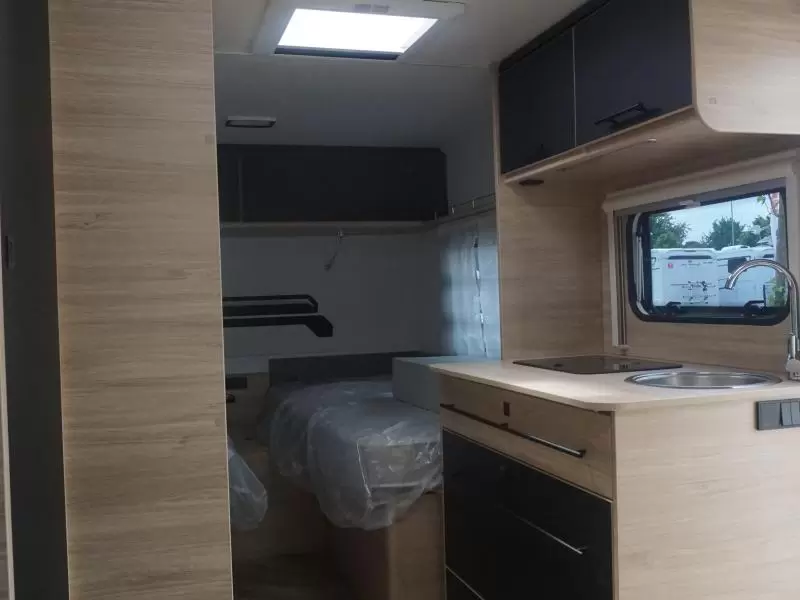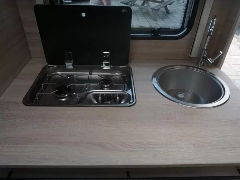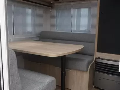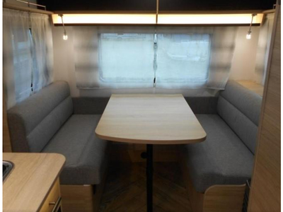 Keuken en sanitair: De caravan beschikt over een middenkeuken met een 3-pits gasfornuis, een 150 liter koelkast met vriesvak, een 5-liter boiler en een lade voor extra opbergruimte. Het sanitair is voorzien van een vaste schoonwatertank van 50 liter, afvalwatertank van 30 liter, cassettetoilet, douche en een toilet/wasruimte.