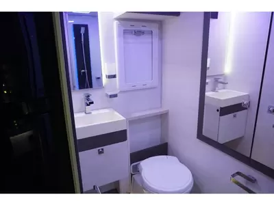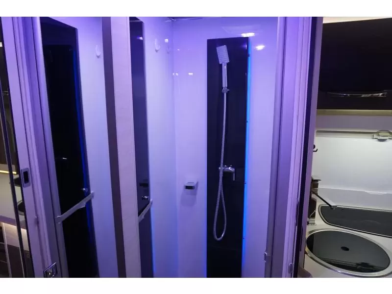 Het queensbed dat vrijstaat van de wanden geeft het gevoel van luxe en ruimte. Een handige ruimtewinner is het tweepersoons hefbed, dat zich boven de zitgroep bevindt. In de 2 aparte bedden heeft ieder zijn eigen slaapplek. In de comfortabele badkamer van deze camper vindt u behalve een wastafel ook een ingebouwd cassettetoilet. Wilt u zich onderweg opfrissen? Dat kan gezien de camper voorzien is van een douchecabine.