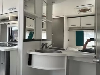 De riante rondzit is ideaal om gezellig aan te eten en te drinken, maar kan ook als extra slaapplaats dienen. Centraal in de caravan bevindt zich de praktisch ingedeelde en ruime middenkeuken, welke geheel compleet is uitgerust met een spoelbak, kraan en 3-pits kooktoestel. De apothekerskast biedt u een fraaie opbergruimte voor al uw voorraad. De 5 liter boiler, die in de caravan is ingebouwd, voorziet u snel van warm water. De ladekast biedt u een fraaie bergplaats voor al uw keukenspulletjes.