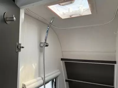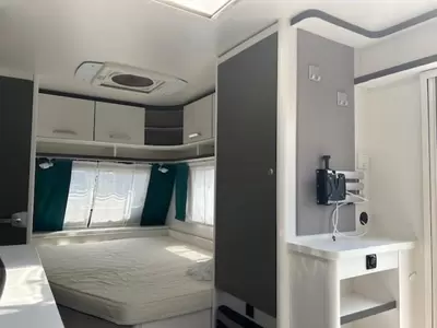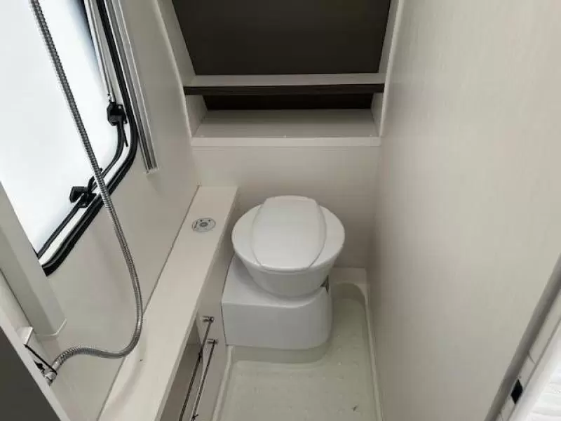 Het ruime, in de lengte geplaatste Franse bed is geschikt voor 2 personen. Behalve een cassettetoilet heeft de badkamer ook een wastafel, waar u zich lekker op kunt frissen. In de caravan kunt u ook douchen. Er bevindt zich een doucheruimte naast het slaapgedeelte.