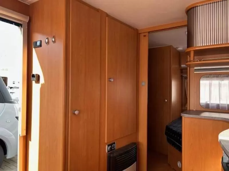 In de praktische rondzit waarmee de caravan is uitgerust, kunt u genieten van heerlijke maaltijden en gezellige avonden. De caravan beschikt over een middenkeuken met voldoende bergruimte, die praktisch is ingericht en met een 3-pits kooktoestel, spoelbak en kraan is uitgevoerd. Voor een snelle toevoer van warm water is er een 5 liter boiler aanwezig. De ingebouwde koelkast (89 liter) met vriesvak is uitgevoerd in een ruime uitvoering. De keukenbenodigdheden vinden een plekje in de ladekast.