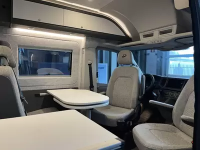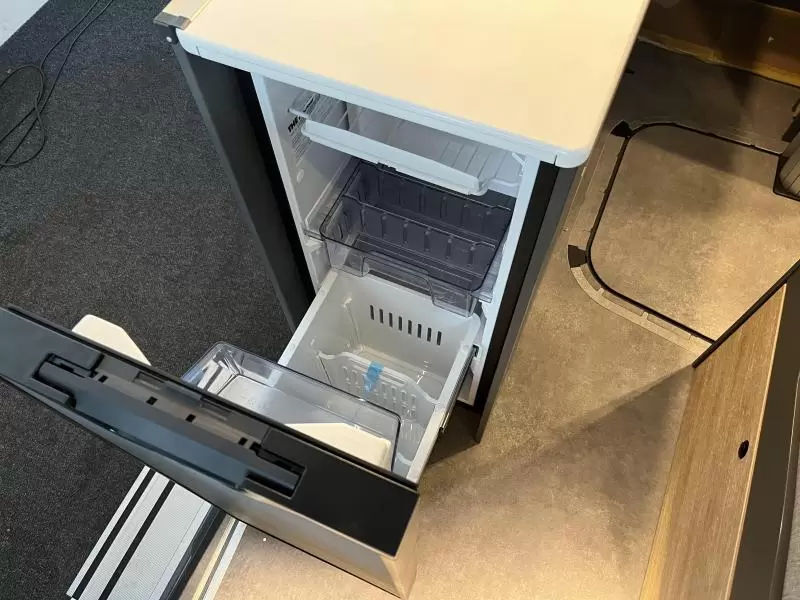 In de ruime treinzit vindt u een gezellige plek om te zitten, deze kan uiteraard ook dienen als extra slaapplaats. De keuken is in het midden van de camper geplaatst en beschikt over een 2-pits kooktoestel en gootsteen met kraan. De boiler, die in de camper is ingebouwd, voorziet u snel van warm water. Om uw etenswaren op te bergen is er een koelkast met vriescompartiment ingebouwd.