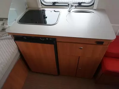 Verder beschikt de caravan over een kleine zit, die een prettige plek om rustig te lezen, te spelen of wat te drinken biedt. De ingebouwde koelkast (81 liter) met vriesvak is uitgevoerd in een ruime uitvoering.