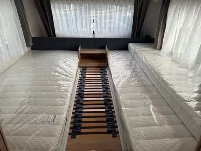 De slaapgelegenheid bestaat uit 2 aparte bedden. U kunt zich heerlijk opfrissen bij de wastafel in de badkamer, waar tevens een cassettetoilet ingebouwd.