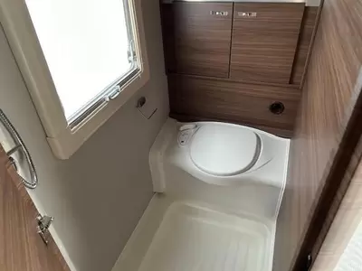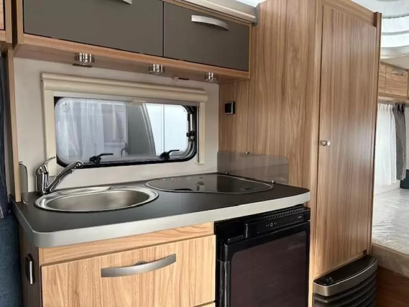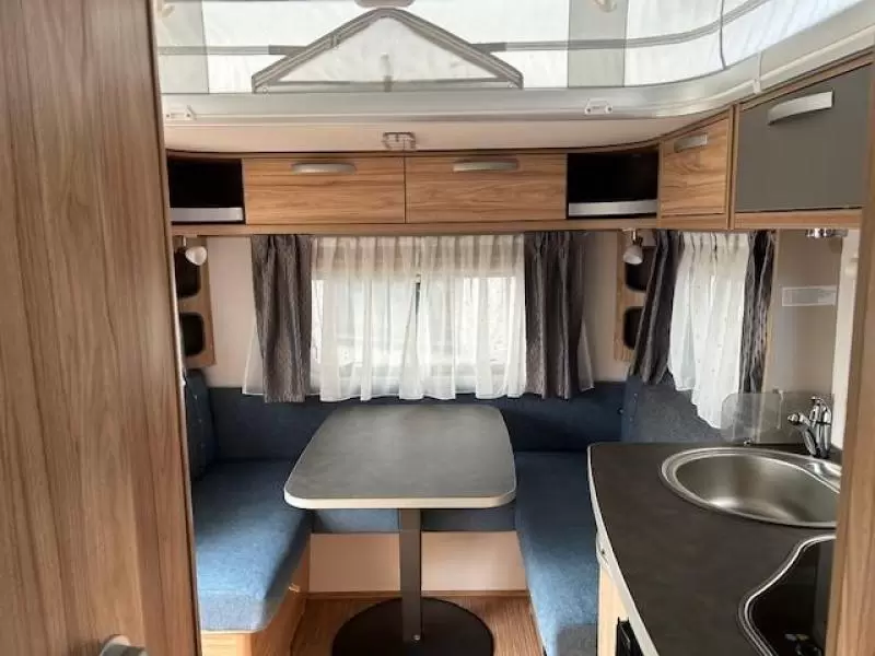 De caravan heeft een gezellige rondzit die u eenvoudig kunt ombouwen tot comfortabele slaapplaats. Centraal in de caravan bevindt zich de praktisch ingedeelde en ruime middenkeuken, welke geheel compleet is uitgerust met een spoelbak, kraan en 3-pits kooktoestel. De boiler, die in de caravan is ingebouwd, voorziet u snel van warm water. De koelkast met vriesvak biedt voldoende ruimte voor heel uw voorraad.