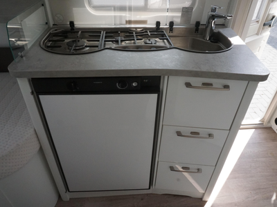 De handige standaardzit biedt niet alleen de nodige ruimte om te zitten, maar kan ook als slaapgelegenheid worden gebruikt. De luxe en compleet uitgevoerde keuken van deze Eriba caravan heeft onder andere een afzuigkap om overtollige warmte en kooklucht af te kunnen voeren. Er is een 5 liter boiler aanwezig, die u van warm water voorziet. De koelkast met vriescompartiment is ruim genoeg voor al uw etenswaren.