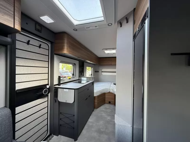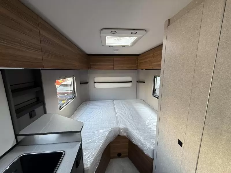 Door de standaardzit voor en achter heeft u veel zitruimte. U kunt zelf bepalen welke u ombouwt tot slaapgelegenheid. De keuken is in het midden van de caravan geplaatst en beschikt over een 2-pits kooktoestel en gootsteen met kraan. Er is een warmwatervoorziening in de vorm van een boiler aanwezig. De koelkast (133 liter) met vriescompartiment is ruim genoeg voor al uw etenswaren. De praktische ladekast is een handige plek voor de keukenbenodigdheden.