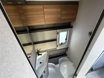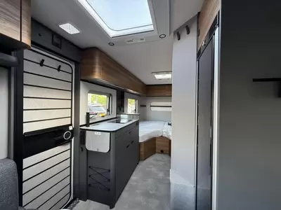 Het in de lengte van de caravan geplaatste bed biedt voldoende ruimte voor 2 personen. De badkamer biedt wasgelegenheid in de vorm van een wastafel. Ook is er een ingebouwd cassettetoilet.