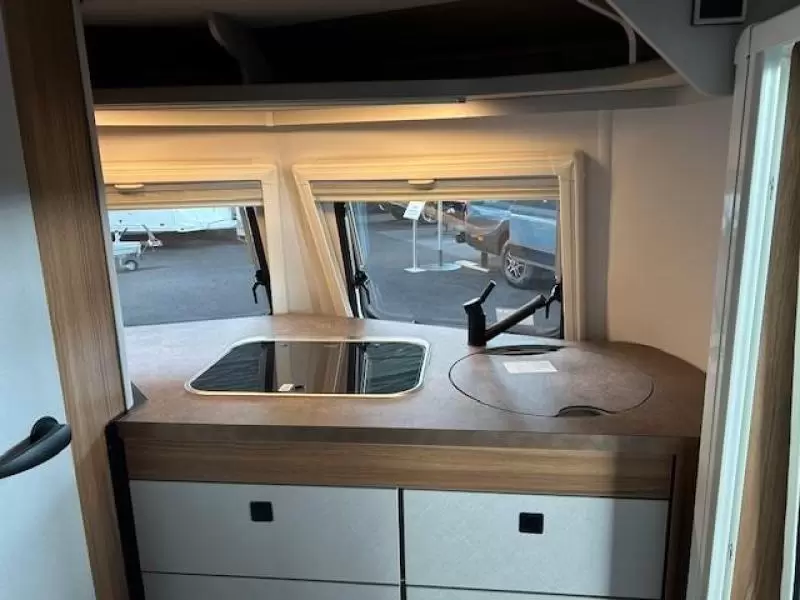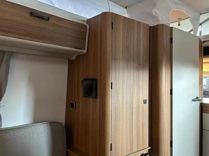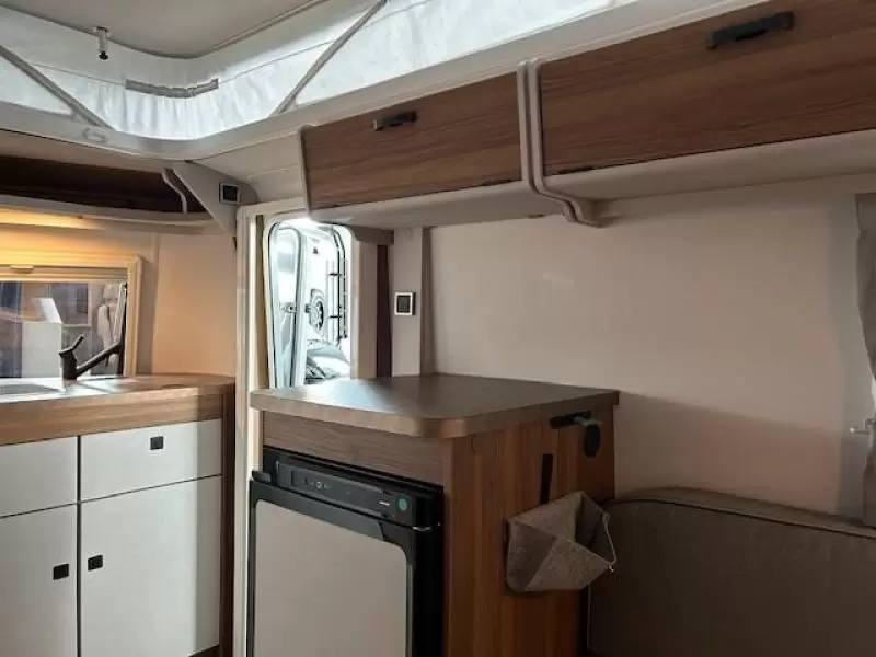 Door de praktische standaardzit, die eenvoudig tot bed kan worden omgebouwd, heeft u de nodige zit- en slaapgelegenheid. De inbouwkoelkast met vriescompartiment heeft een grote inhoud.