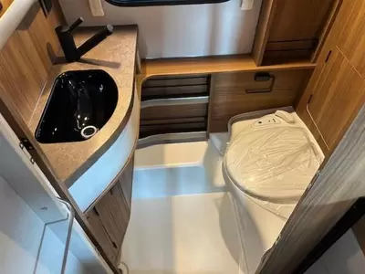 Slapen doet u op de 2 aparte bedden, die borg staan voor extra ruimte en een makkelijke instap. In de badkamer, waar deze caravan over beschikt, vindt u een ingebouwd cassettetoilet en een wastafel.