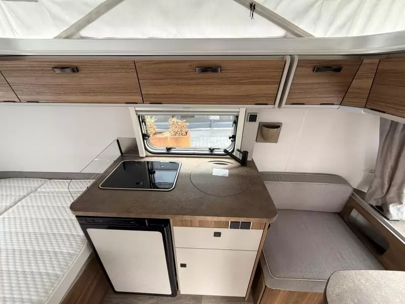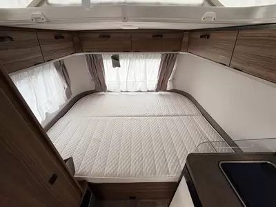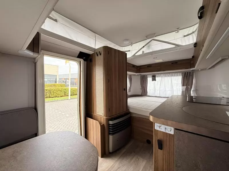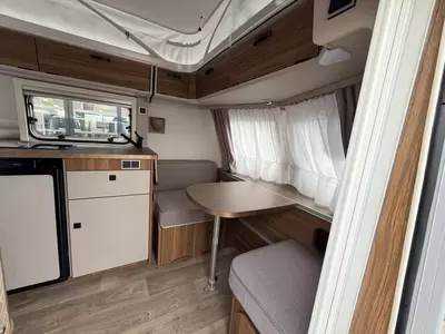De handige standaardzit biedt niet alleen de nodige ruimte om te zitten, maar kan ook als slaapgelegenheid worden gebruikt. De caravan beschikt over een middenkeuken met voldoende bergruimte, die praktisch is ingericht en met een 2-pits kooktoestel, spoelbak en kraan is uitgevoerd. De koelkast met vriesvak biedt voldoende ruimte voor heel uw voorraad.