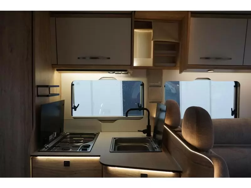 Een sfeervolle L-zit nodigt u uit voor de nodige gezellige uurtjes. Centraal in de camper bevindt zich de middenkeuken, uitgerust met een spoelbak, kraan en 3-pits kooktoestel. Er is een boiler aanwezig, die u van warm water voorziet. De koelkast met vriescompartiment is ruim genoeg voor al uw etenswaren.