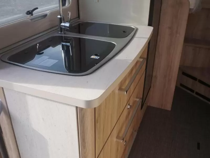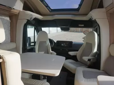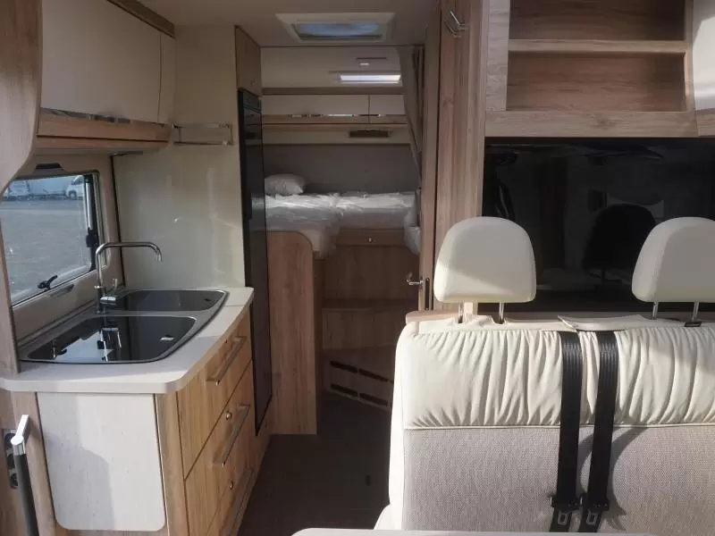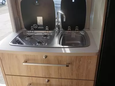 De camper is voorzien van een handige L-zit voor een sfeervol samenzijn. De keuken is in het midden van de camper gemonteerd. Voor een snelle toevoer van warm water is er een boiler aanwezig. De koelkast met vriescompartiment is ruim genoeg voor al uw etenswaren.