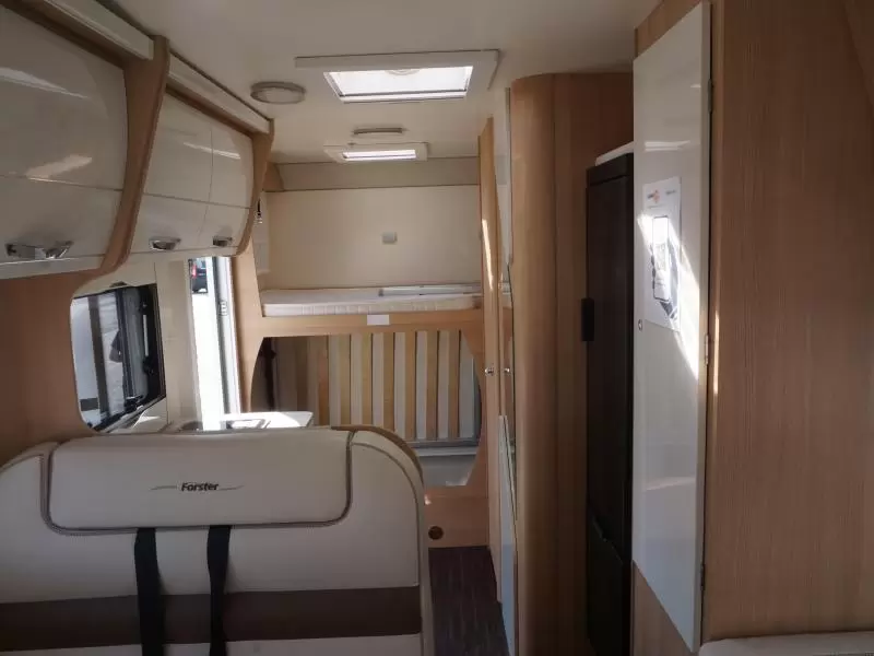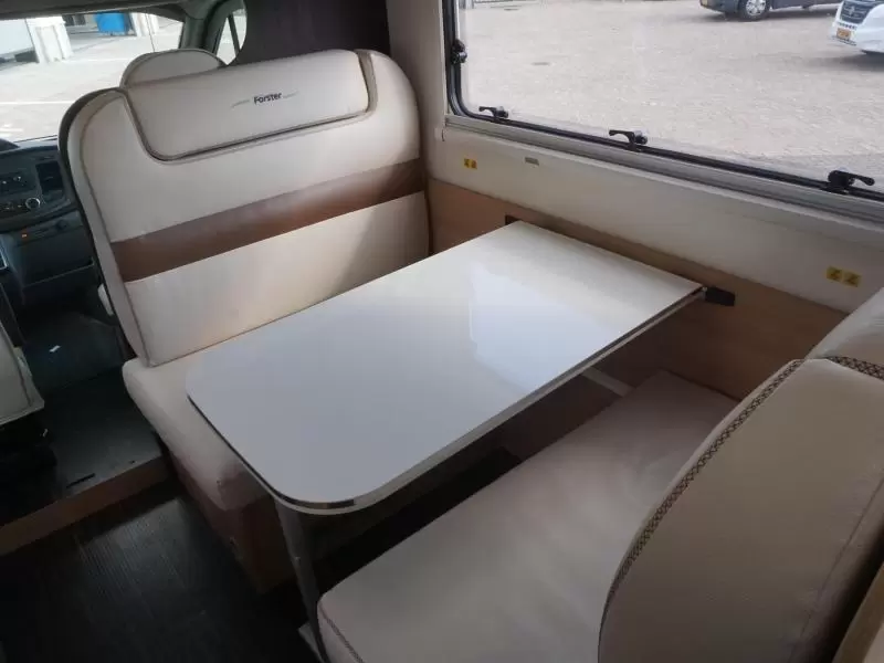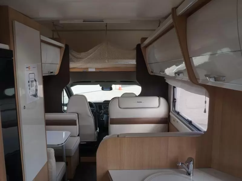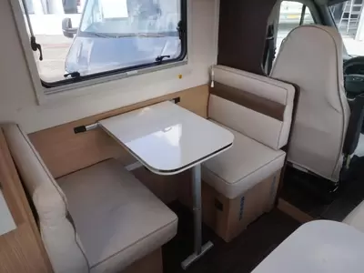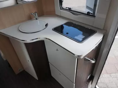 In de ruime treinzit vindt u een gezellige plek om te zitten, deze kan uiteraard ook dienen als extra slaapplaats. De keuken is in het midden van de camper gemonteerd. Een ingebouwde boiler voorziet u van warm water. De ingebouwde koelkast met vriesvak is uitgevoerd in een ruime uitvoering.