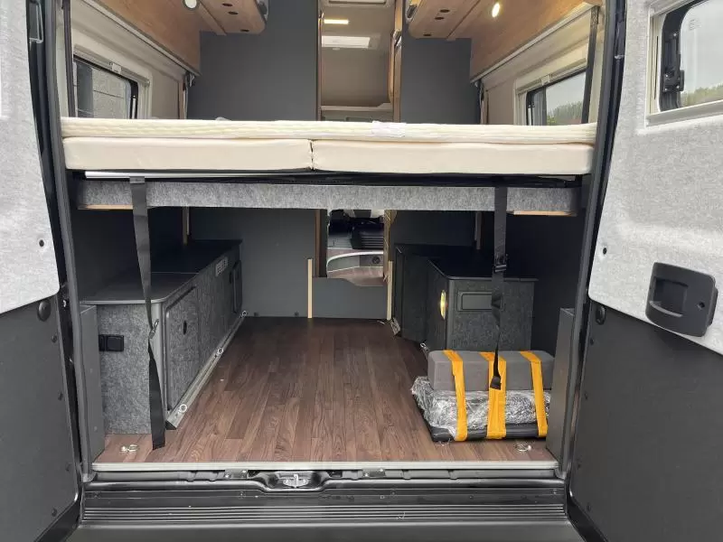 Een ruime camper voorzien van een 2 persoonshefbed aan de achterzijde. Deze is in hoogte verstelbaar, zodat er aan de onderkant een zee van bergingsruimte ontstaat.