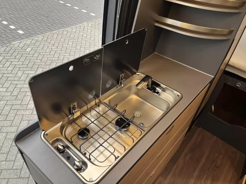 De keuken is in het midden van de camper geplaatst en beschikt over een 2-pits kooktoestel en gootsteen met kraan. De boiler, die in de camper is ingebouwd, voorziet u snel van warm water. De ingebouwde koelkast met vriesvak is uitgevoerd in een ruime uitvoering.