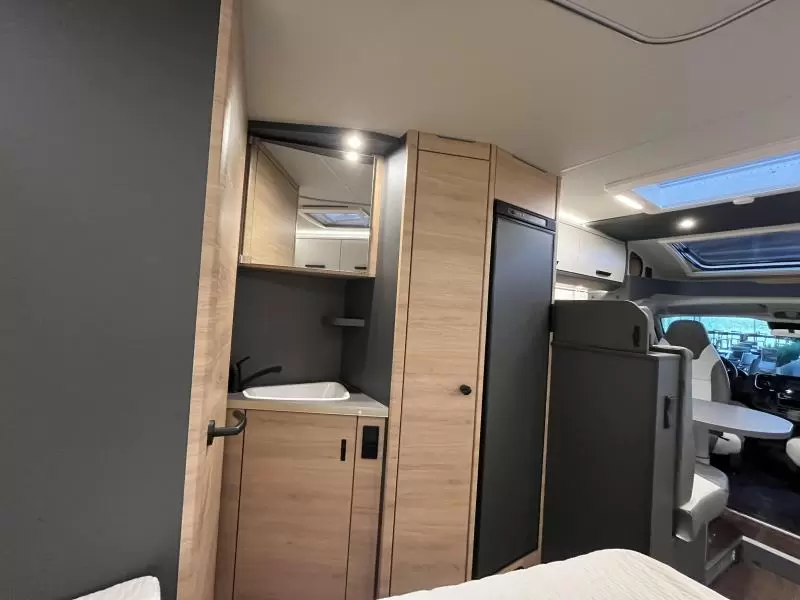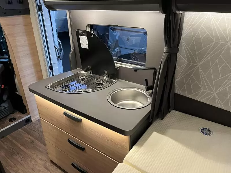 Door de ruime en comfortabele L-zit nodigt de camper uit voor gezellige avonden. De keuken is in het midden van de camper geplaatst en beschikt over een 3-pits kooktoestel en gootsteen met kraan. Een ingebouwde 10 liter boiler voorziet u van warm water. De koelkast (142 liter) met vriesvak biedt voldoende ruimte voor heel uw voorraad.