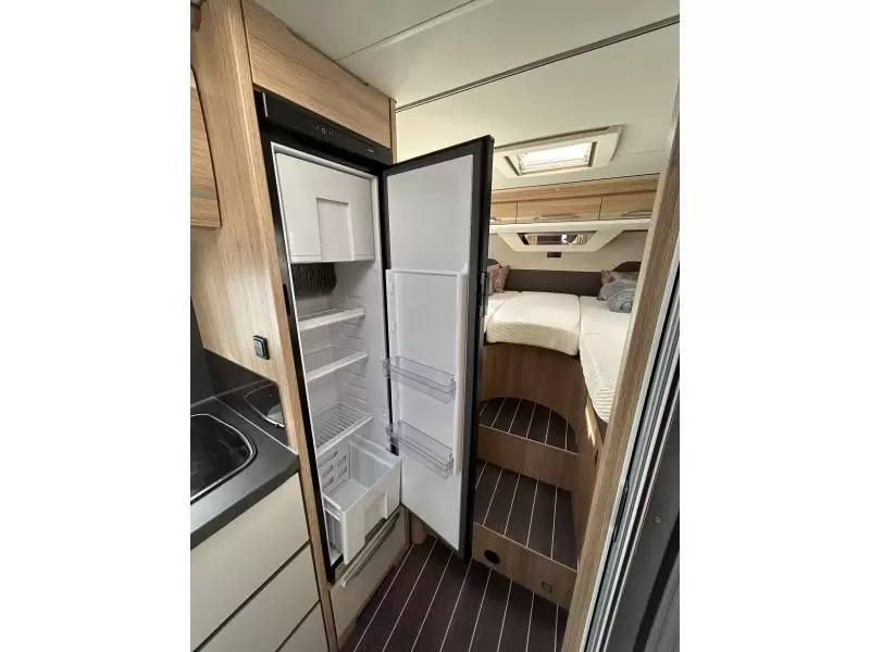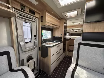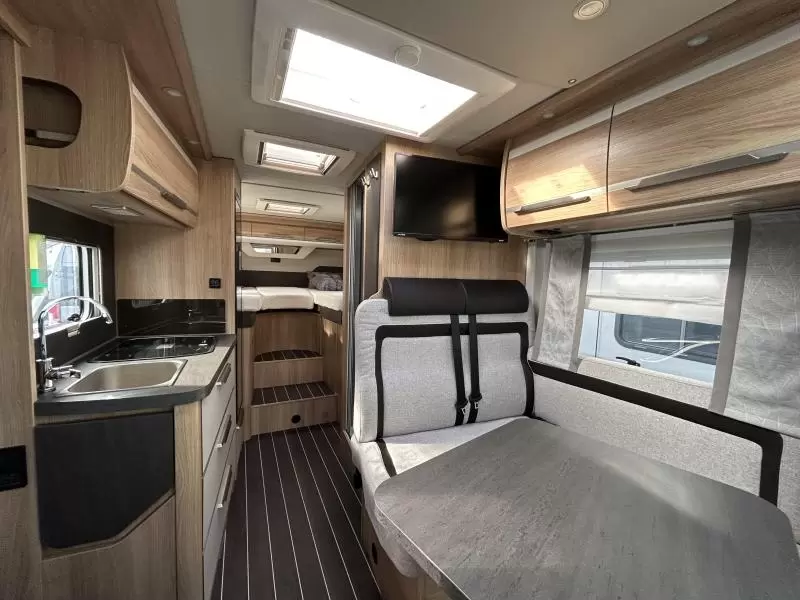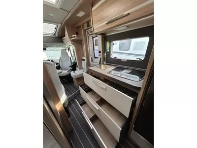 Om gezellig samen te kunnen zitten, eten en drinken is de camper voorzien van een comfortabele middendinette. De keuken is in het midden van de camper geplaatst en beschikt over een 3-pits kooktoestel en gootsteen met kraan. Er is een boiler aanwezig, die u van warm water voorziet. De inbouwkoelkast met vriescompartiment heeft een grote inhoud.
