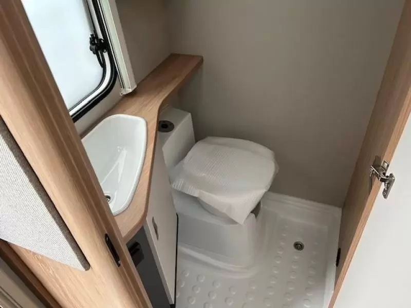 Het dwars geplaatste bed biedt voldoende ruimte voor 2 personen. In de badkamer, waar deze caravan over beschikt, vindt u een ingebouwd cassettetoilet en een wastafel.