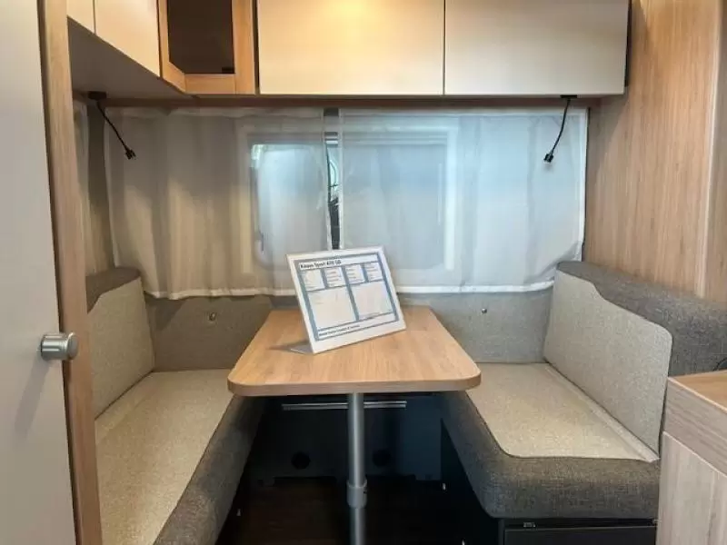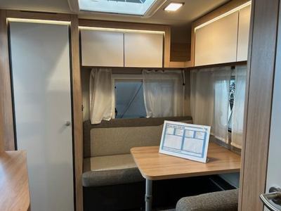 Een extra slaapgelegenheid wordt gevormd door de comfortabele, gezellige treinzit. Het keukenblok, dat centraal in de caravan is gemonteerd, heeft voldoende bergruimte en is uitgerust met een 3-pits gascomfoor, spoelbak en kraan. Een ingebouwde boiler voorziet u van warm water. De koelkast met vriesvak biedt voldoende ruimte voor heel uw voorraad.