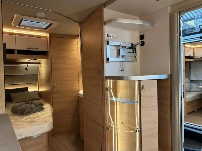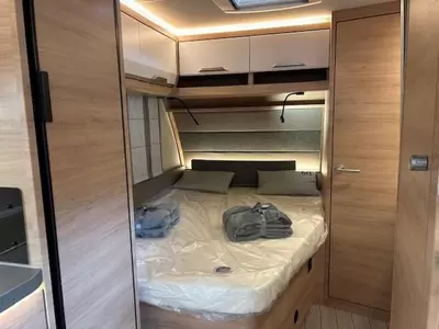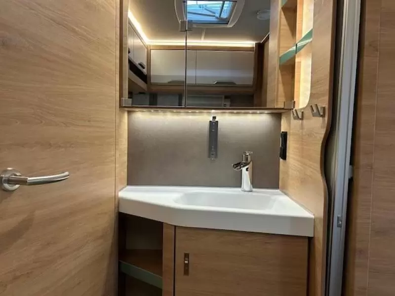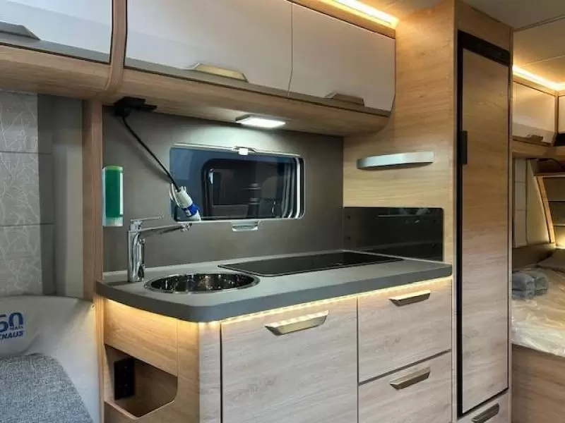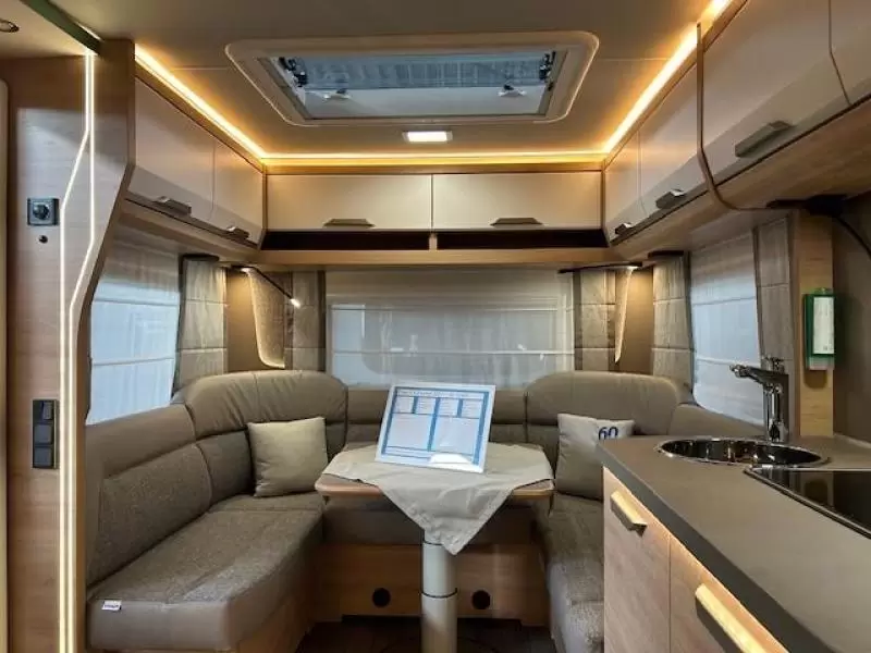 De ruime rondzit, waar deze caravan over beschikt, kan ook als slaapgelegenheid worden gebruikt. De complete keuken is in het midden van de caravan geplaatst. Voor een snelle toevoer van warm water is er een boiler aanwezig. De ingebouwde koelkast met vriesvak is uitgevoerd in een ruime uitvoering.