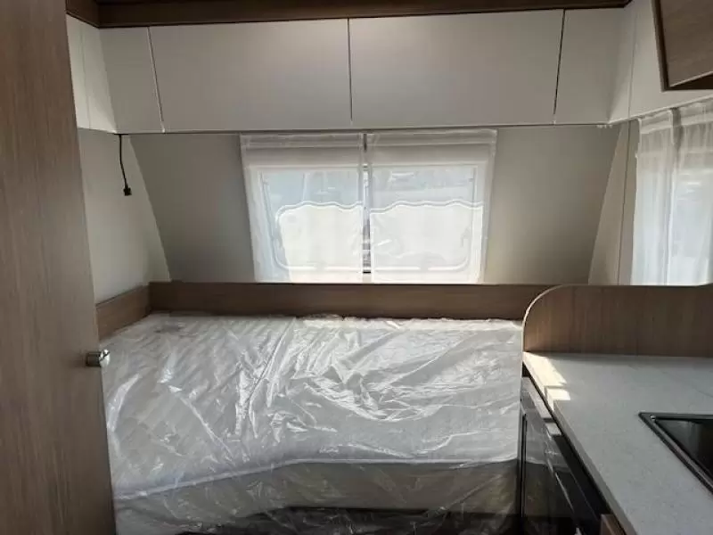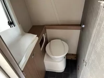 Het dwars geplaatste bed biedt voldoende ruimte voor 2 personen. Behalve een cassettetoilet heeft de badkamer ook een wastafel, waar u zich lekker op kunt frissen.