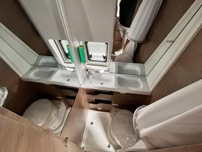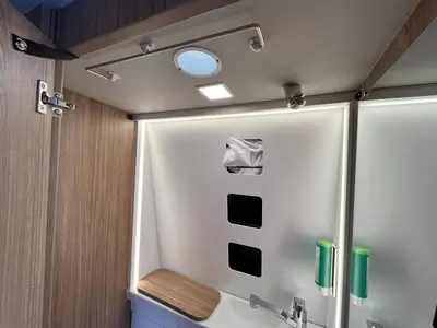 In de badkamer vindt u een wastafel om u op te frissen, alsmede een ingebouwd cassettetoilet. Wilt u zich onderweg opfrissen? Dat kan gezien de camper voorzien is van een douchecabine.
