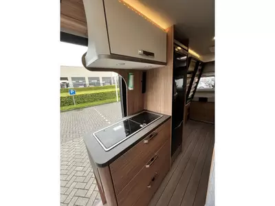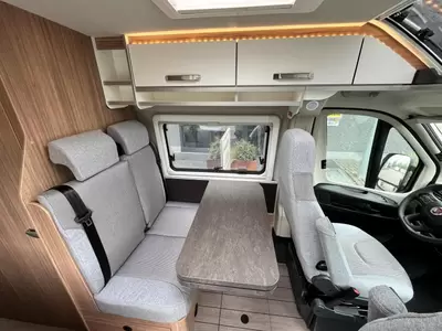 Een gezellige plek om te zitten vindt u in de centrale halve treinzit, deze kan uiteraard ook dienen als extra slaapplaats. De complete keuken is in het midden van de camper geplaatst. Voor een snelle toevoer van warm water is er een boiler aanwezig. De extra grote koelkast (150 liter) met vriescompartiment is ruim genoeg voor al uw etenswaren.