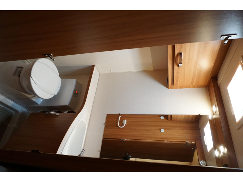 De caravan beschikt over een ruim, tweepersoons bed dat dwars is geplaatst. Deze caravan beschikt over een badkamer. Hierin bevindt zich een wastafel en ingebouwd cassettetoilet.