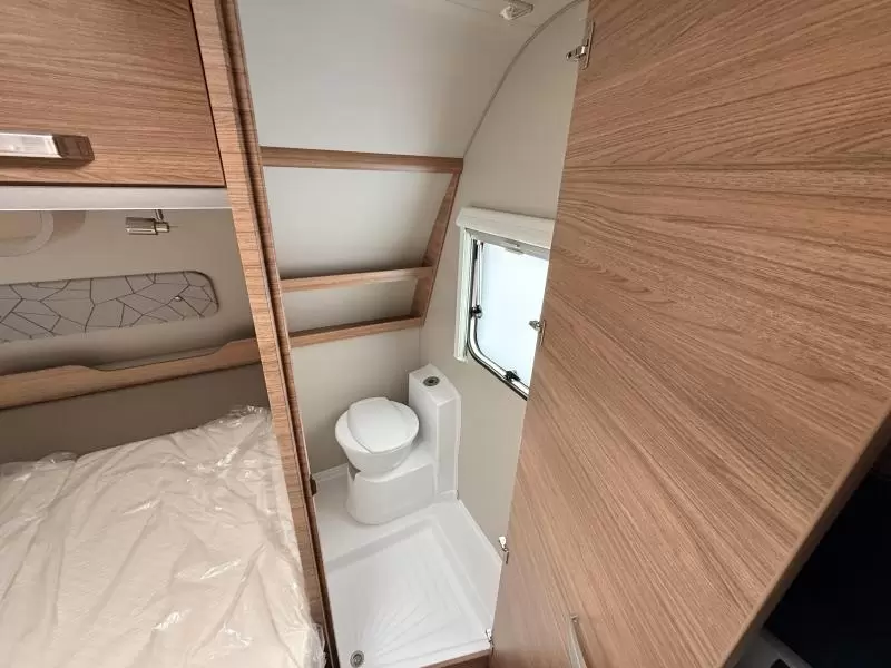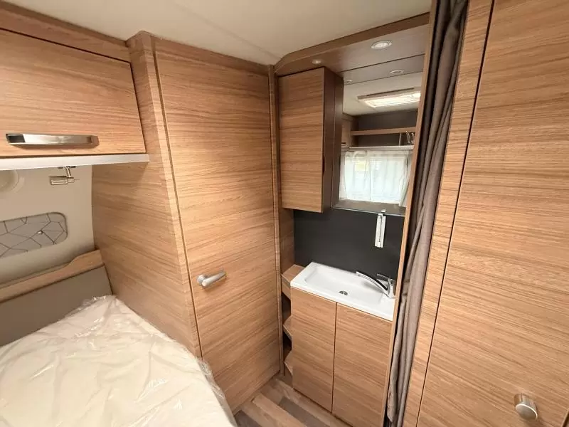 De centraal geplaatste middendinette biedt volop gelegenheid voor heerlijke maaltijden en gezellige avonden. De middenkeuken, waar de caravan over beschikt, is onder meer voorzien van een 3-pits kooktoestel, spoelbak en kraan. De praktische apothekerskast biedt een zee aan ruimte voor uw voorraad. Een ingebouwde boiler voorziet u van warm water. De inbouwkoelkast met vriescompartiment heeft een grote inhoud. De keukenbenodigdheden vinden een plekje in de ladekast.